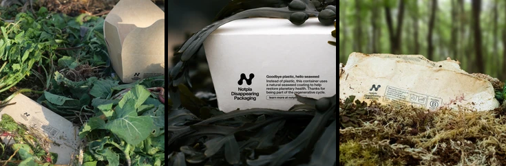 Notpla packaging regenerates into fertile soil, decomposing naturally in home composts, becoming food for worms, fungi, and microbes. Watch as all the PLA (a bioplstic) coated board fails to disappear, leaving behind the plastic coating laminated onto the cardboard surface which will go on to be broken down into microplastics. (Click play below)